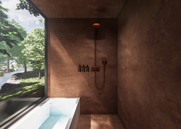 素材で言うと、もし天然素材が使えないとしても、天井、壁、床に至るまでアースカラーを用いてワントーンにまとめるなど、既存の材料であっても塗装の風合いや仕上がりを統制していくことで、上質さは高まります。照明は最低限でいいんです。もし明るさが足りなかったらキャンドルを置いてお風呂に入ってはいかがでしょうか。一日を終えて、心身を整えるために入るケースの多い空間なので少ししっとりさせる。他の部屋と同じように自分に合う照度を作り出す、調光照明的な考え方の方がむしろ適しているんじゃないかと思います。夜になって入るとき、空間が明るすぎるのは時間軸に反しているような気がします。あとは「aq.」はユニットでありながら開口部をかなり自由につくれるというので、やはり窓を大きく開けて外の景色を取り込みたいですね。そうすることで空間が拡張されるような感覚が生じます。視覚的にも気持ちがいいし、換気も良くなる。